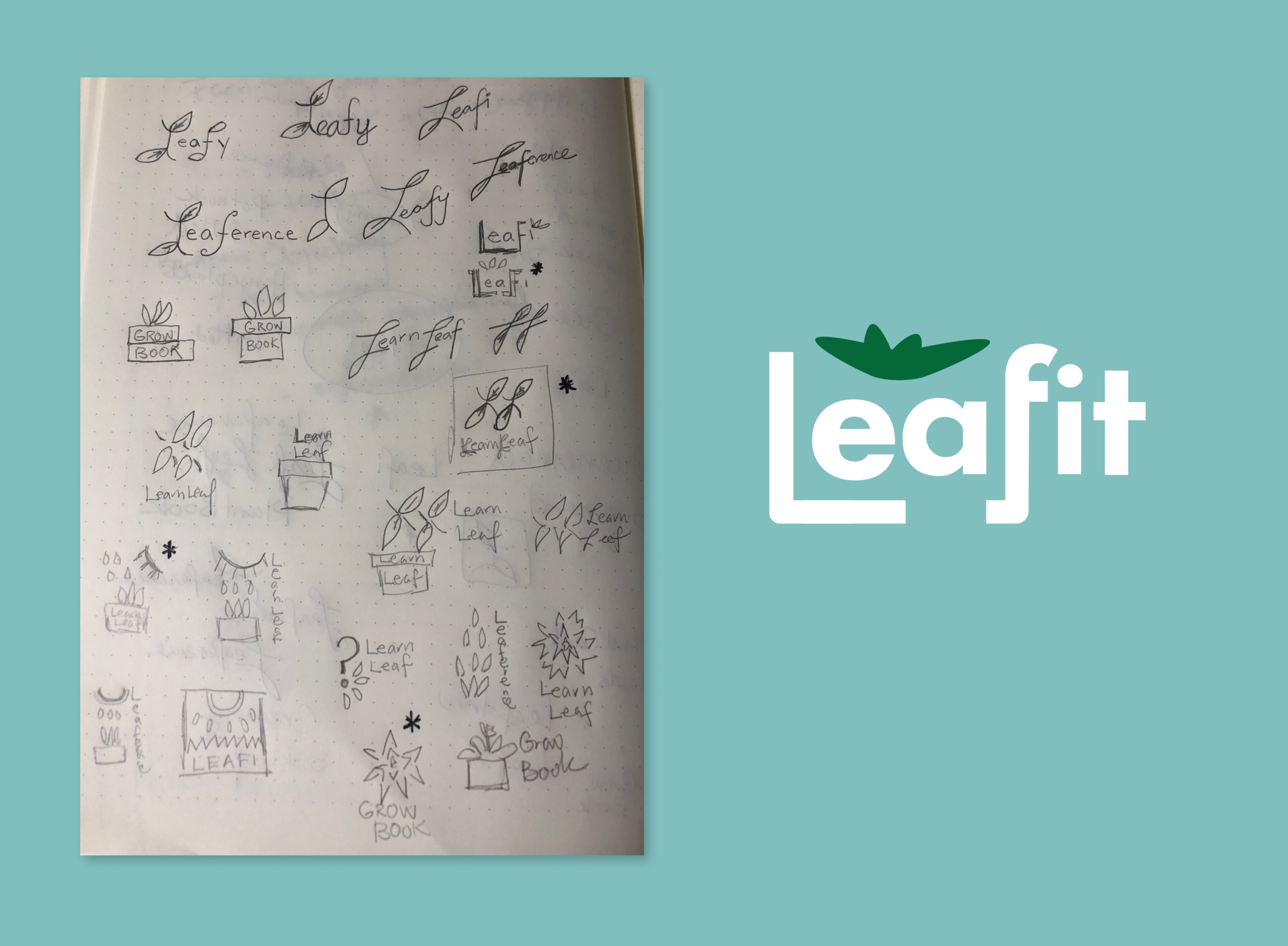 I brainstormed a name for my app and landed on Leafit (Leaf + fit). I knew I wanted to include an organic element in the logo. I sketched a few, brought them into vector format, and shared them with some other students for feedback. Everyone preferred this logo in which the “Leaf” is in the shape of a pot, and the plant is on top. I rounded some of the edges of the type to soften the look to be more organic.